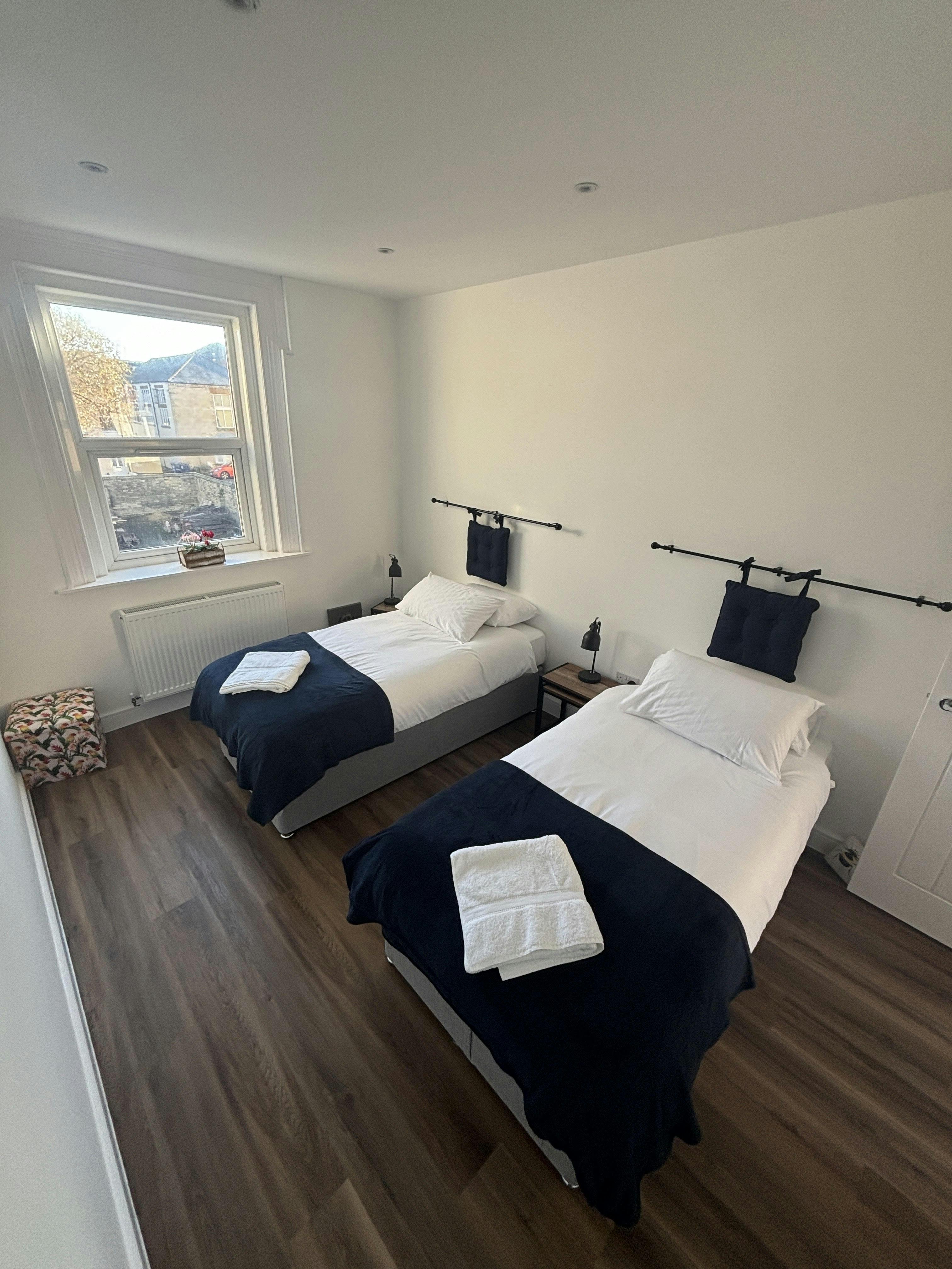 Experience the ultimate in comfort and elegance in our stunning 2-bedroom luxury coach house apartment (navy). Ideal for families, friends, or couples seeking a spacious retreat, this beautifully appointed apartment features two en-suite bedrooms, ensuring privacy and convenience for all guests. The apartment has a double bed room and a room situated with 2 single beds.